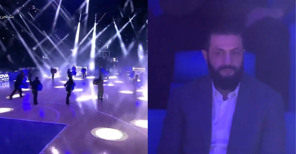 “فاتحِ شام، صدر احمد الشرع کی موجودگی میں فیحاء ہال کا افتتاح، امریکی ریپر اور ڈانسر مسی ایلیٹ کی مشہور راب گانے ’’Work It‘‘ کی دھنوں پر۔”